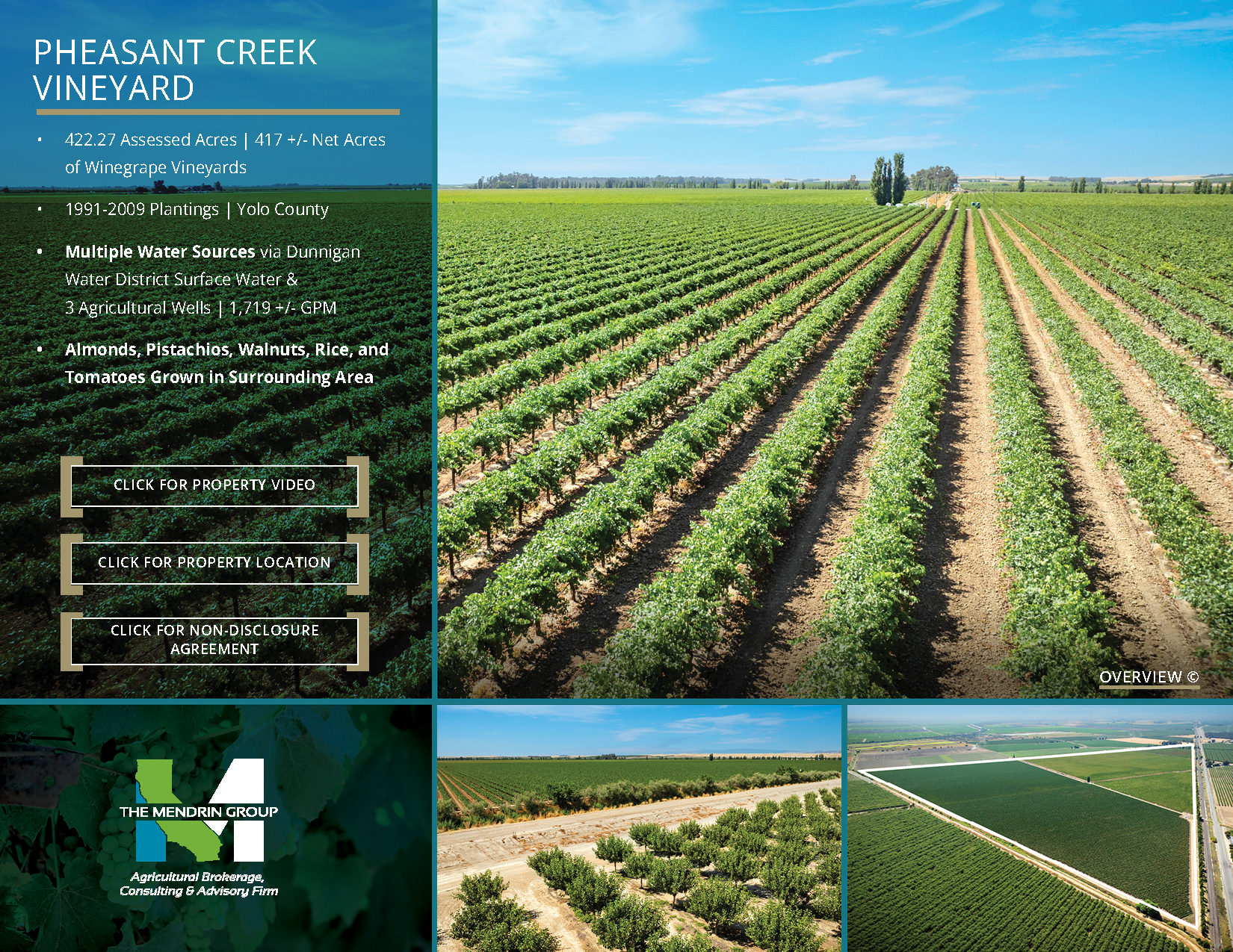• Purchase Price: $6,500,000 all cash at the close of escrow ($15,393 per gross acre, $15,587 per net planted vine acre).